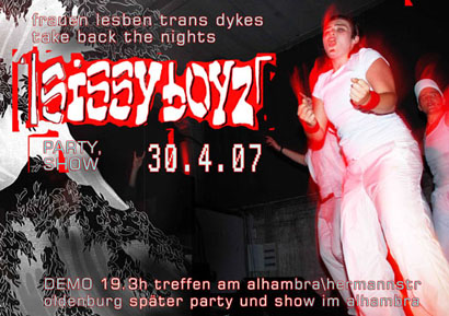 FRAUENLESBENDRAGPARTY, im Alhambra, Soli-Party zur Unterstützung des "Toros"-Prozeß dessen Kosten noch immer nicht gedeckt sind. "OH, my god they´re back again..." vom Sturm singend nach Oldenburg gefegt, entblättern die Boyz nach einem Jahr Bühnenpause gekonnt ihre muskulösen Körper. Die Party ist ein voller Erfolg, mit dabei ist die Drag King Gruppe westlite aus Hannover - attention: diese Jungz blicken euch tief in die Augen - und am Ende gibt es einen freundschaftlichen Battle zu den Klängen von "I wanna be gaylight in your eyes". Des Nachts flüstern und randalieren aufgebrachte Sissys und ihre Security Crew im Schlafsaal und ey, Klassenfahrt?