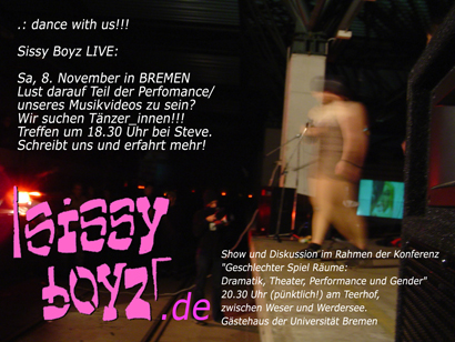 RRIOT TRASH DE LUXE Männerfreie Soli-Party im Sielwallhaus, Bremen. Eine offene Bühne mit Boy Group Show können Dan, Joey, Denniz, Steve und Mike sich nicht entgehen lassen. Erster Auftritt der Sissy Boyz: "I can see it in your eyes, there is something, something you want to tell me, there is something that you hide from me.." zusammen mit Take That und anderen Boy-Schnittchen, moderiert von Miss Megalomania. Es wird gekreischt und getanzt, je später die Stunde, desdo zahlreicher die Boyz.